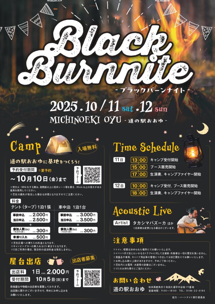 2025年10月11日(土)・12日(日) 大湯温泉郷で体感するアウトドアナイト! 10/11(土)・10/12(日)の2日間、道の駅おおゆにて「BLACK BURN NITE2025(ブラックバーンナイト)」が開催されます。音楽ライブ、屋台、キャンプと楽しめるコンテンツが盛りだくさん!アコースティックライブやキャンプファイヤーが大湯の夜を彩ります。道の駅おおゆを舞台にした特別なキャンプと音楽体験を、ぜひお楽しみください。【開催日】2025年10月11日(土)、12日(日)【会場】道の駅おおゆ(秋田県鹿角市十和田大湯字中谷地19)【WEB】https://yunoeki-oyu.jp/ 次の記事へ 一覧へ 前の記事へ