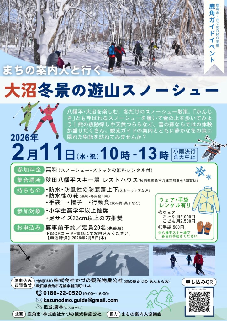 2026年2月11日(水・祝) まちの案内人と行く、冬だけの八幡平体験 2/11(水・祝)、八幡平・大沼を舞台に、冬の自然を気軽に楽しむスノーシューイベントが開催されます。スノーシューを履いて雪原へ出かけ、熊の足跡など動物の痕跡や天然つららなど、冬ならではの発見を体験!地元を知り尽くした観光ガイド「まちの案内人」と一緒に、静かな雪景色の中をゆったり歩きます。冬の八幡平で、遊んで・学んで・癒される“冬の遊山”をぜひお楽しみください。【開催日】2026年2月11日(水・祝)【時間】10:00~13:00【集合場所】秋田八幡平スキー場 レストハウス【参加費】無料(スノーシュー・ストック無料レンタル付き)【定員】20名(要事前申込・先着順)【対象】小学生高学年以上推奨/足サイズ23cm以上推奨【持ち物・服装】防水・防風性の防寒着上下、防水性の靴(長靴・冬用登山靴)、手袋、帽子、飲み物・行動食【お申込み】申込フォームまたはお電話にてお申込みください。①WEB こちらをクリック!②電話 0186-22-0520(9:00~16:00/株式会社かづの観光物産公社・道の駅かづの)【申込締切】2026年2月5(木)12:00【その他ご案内】小雨決行/荒天中止(小雨の場合は雨具をご持参ください。) 一覧へ 前の記事へ