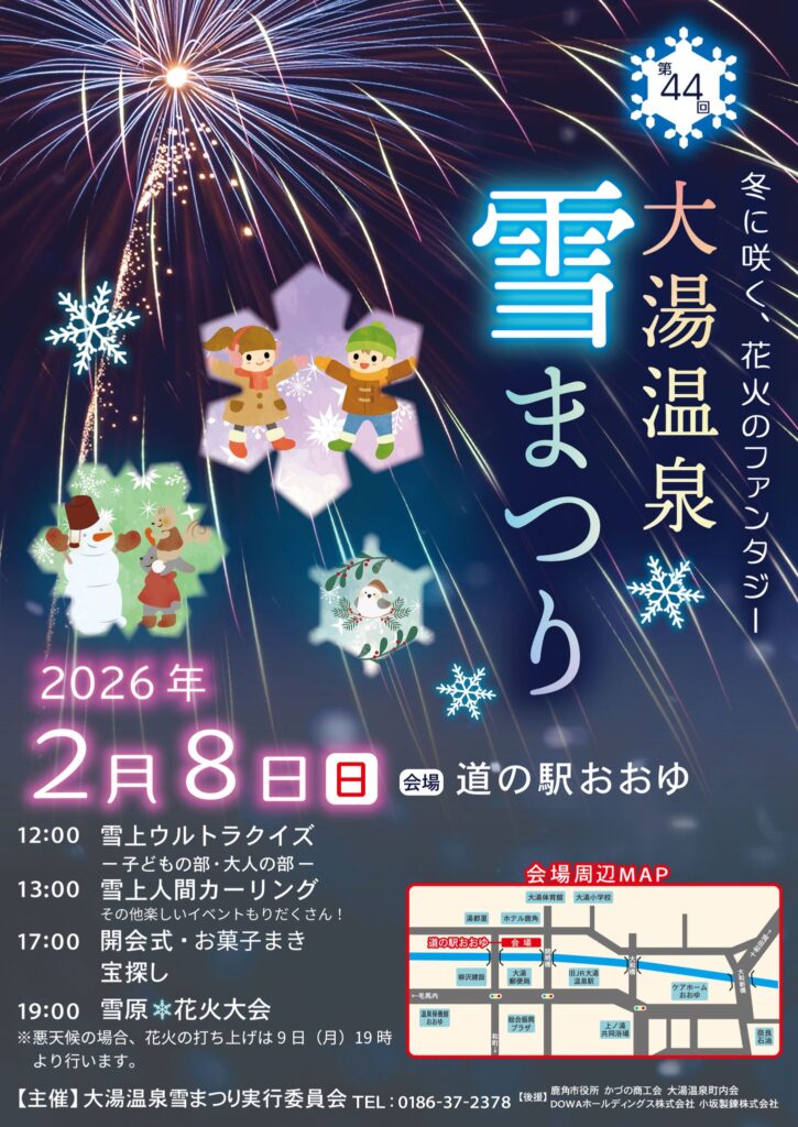 2026年2月8日(日) 雪あそび&温泉を満喫しよう! 2/8(日)、道の駅おおゆを会場に毎年恒例の「大湯温泉雪まつり」が開催されます。子供から大人まで大盛り上がりの「雪上ウルトラクイズ」や「雪上人間カーリング」、お菓子まき、宝探しなどお楽しみが盛りだくさんなイベントです。フィナーレには冬花火の打ち上げも!会場付近には日帰り温泉施設もあるので、イベントと一緒に温泉もお楽しみください!【開催日時】2026年2月8日(日) 12:00~【会場】道の駅おおゆ(秋田県鹿角市十和田大湯中谷地19)※悪天候の場合、花火の打ち上げは2/9(月)19時に行われます。 一覧へ 前の記事へ