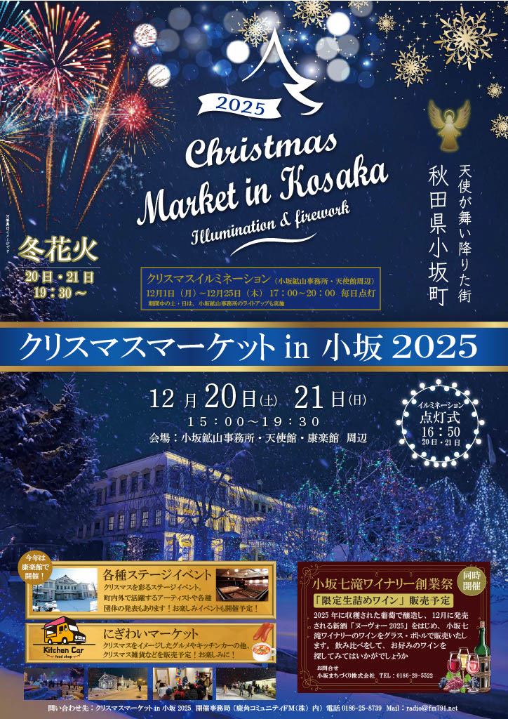 2025年12月20日(土)・21日(日) 「クリスマスマーケット」が今年もやってくる! 12/20(土)・12/21(日)の2日間、小坂の冬の風物詩「クリスマスマーケットin小坂2025」が開催されます!今年も「ワイナリー創業祭」とのコラボ企画が実施され、12/1に解禁する小坂産ワイン「クリスマスヌーヴォー」を中心とした「小坂七滝ワイン」が提供されるほか、両日ともに冬の夜空を彩る冬花火もお楽しみいただけます。小坂鉱山事務所・天使館周辺のイルミネーションやフード、ドリンク、クリスマス雑貨の販売、ステージイベントもあります。ぜひカメラを片手にお出かけください!【開催日時】2025年12月20日(土)/15:00~19:302025年12月21日(日)/15:00~19:30★クリスマスイルミネーションは12月1日(月)~25日(木)の期間中毎日点灯(17:00~20:00)。期間中の土日は小坂鉱山事務所のライトアップも実施されます。【会場】小坂鉱山事務所・天使館周辺(秋田県鹿角群小坂町小坂鉱山古館4)【駐車場】無料(康楽館駐車場、古館駐車場などをご利用ください/周辺道路での路上駐車はご遠慮ください)【WEB】https://www.town.kosaka.akita.jp/machinososhiki/kankosangyoka/kankoshokohan/3/2196.html 次の記事へ 一覧へ 前の記事へ