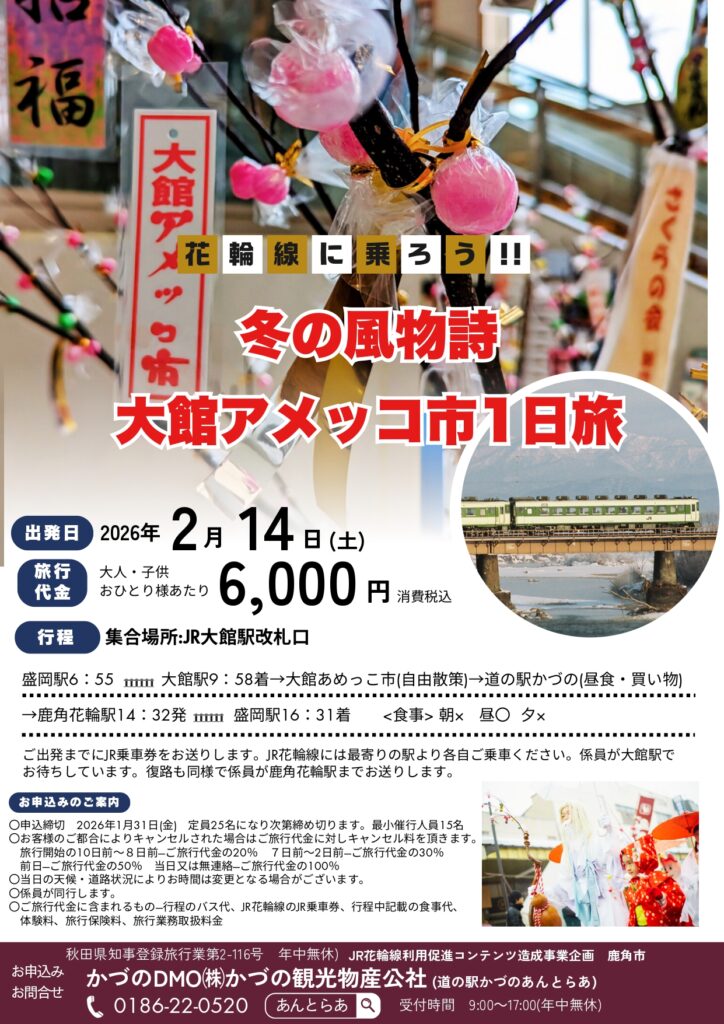 1/10(土)9:00申込受付開始! 2/14(土)、JR花輪線&大館アメッコ市を満喫する日帰りツアーが開催されます。今回のツアーではJR花輪線に乗車するほか、秋田県大館市で約400年前から続く民俗行事「大館アメッコ市」と鹿角グルメをお楽しみいただけます。アメッコ市では「この日にアメを食べると風邪をひかない」と言われており、会場にアメ売り屋台がずらりと立ち並びます。ご自宅用はもちろん、お土産にもおすすめです。そのほか道の駅かづのでのランチやお買い物もぜひお楽しみください。「んめもの(美味しいもの)」づくしのツアーです。鉄道&グルメ旅へぜひご参加ください。 次の記事へ 一覧へ 前の記事へ