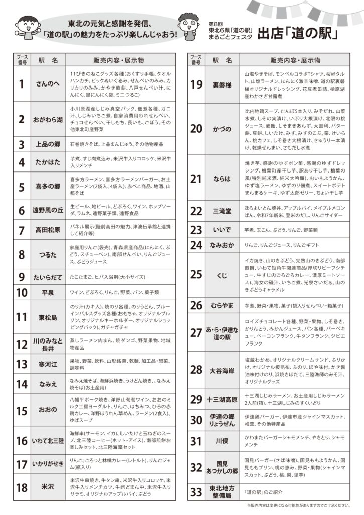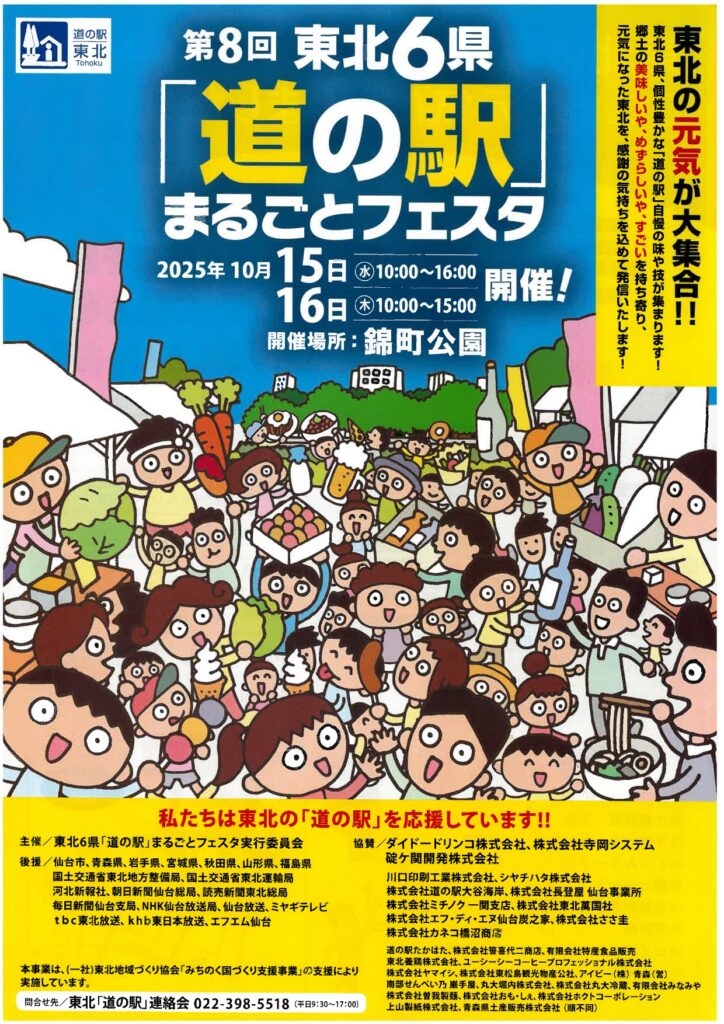 東北6県「道の駅」まるごとフェスタに出店します! 10月15日(水)・16日(木)の2日間、宮城県仙台市にある錦町公園で開催される【第8回 東北6県「道の駅」まるごとフェスタ】に道の駅かづのが出店します!【東北6県「道の駅」まるごとフェスタ】は東北6県の個性豊かな道の駅が大集合!各エリアの美味しい、めずらしい、すごいを持ち寄り、元気いっぱいの東北をお届けするイベントです。今回秋田県からは「道の駅かづの」のみの出店となり、バター餅やいぶりがっこ、北限の桃ジュース、きりたんぽ、漬物などなど鹿角の「んめもの(美味しいもの)」を販売いたします。お近くにお住まいの方はぜひお立ち寄りください!【出店期間】2025年10月15日(水)・16日(木)【営業時間】15日:10:00~16:00/16日:10:00~15:00【場所】仙台市 錦町公園(宮城県仙台市青葉区本町2丁目21)【WEB】https://www.michinoeki-tohoku.com/ 次の記事へ 一覧へ 前の記事へ